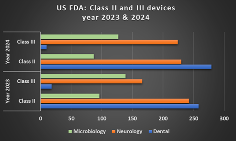 The FDA does not publish a complete annual count of Class I device listings or exemptions, but data on Class II and III device approvals can be accessed through public FDA databases. Approval volume also varies significantly by device panel. For example, in 2023 and 2024, the cardiovascular panel accounted for a high number of clearances and approvals, while panels such as microbiology, neurology, and dental had comparatively fewer—reflected in the chart below.